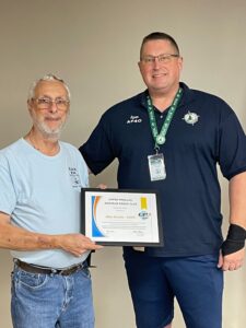 (L-R) Jason N4BOZ receiving the September 2023 President’s Award from Fred W2SUB (Photo by Steve N4FOY)